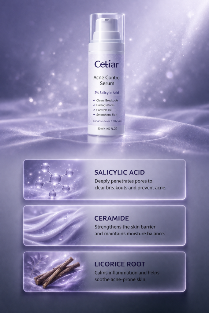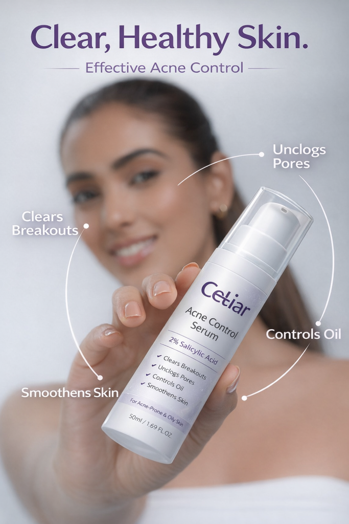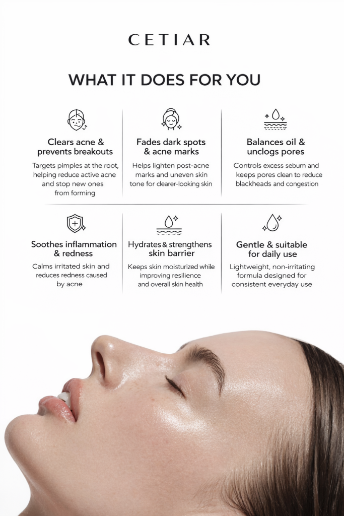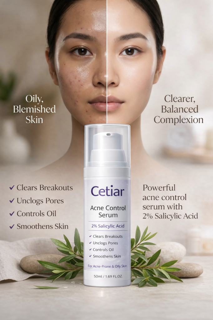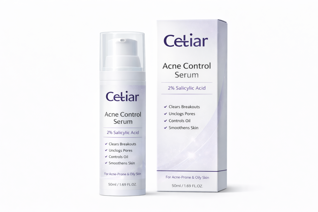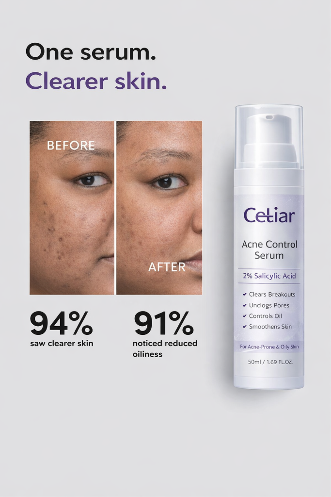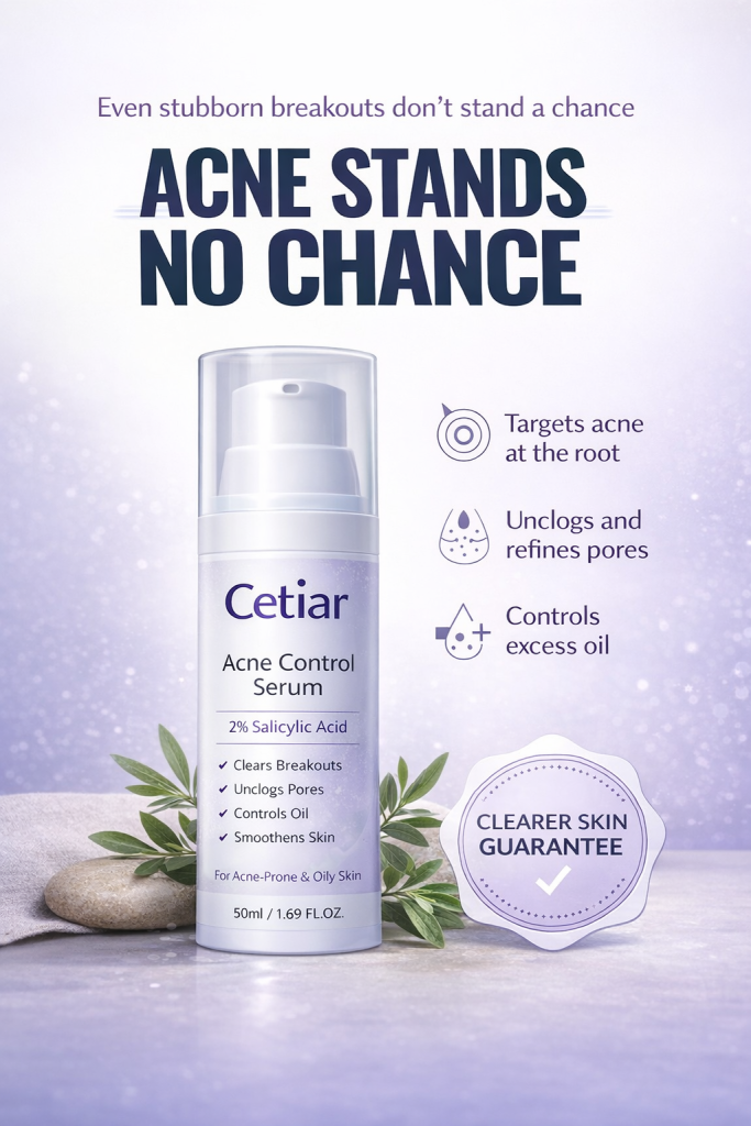 Say goodbye to stubborn acne, dark spots, and rough skin texture. Cetiar Acne Control Serum is a powerful face repair formula designed to fight breakouts, calm inflammation, refine pores, and restore your skin’s natural glow.